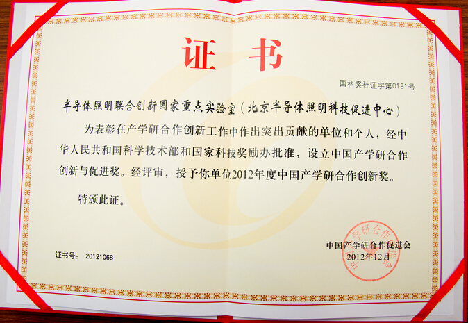 圖為半導(dǎo)體照明聯(lián)合創(chuàng)新國家重點(diǎn)實(shí)驗(yàn)室榮獲中國產(chǎn)學(xué)研合作促進(jìn)會“2012年度中國產(chǎn)學(xué)研合作創(chuàng)新獎(jiǎng)”獲獎(jiǎng)證書。