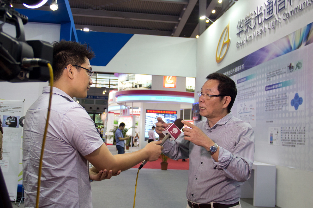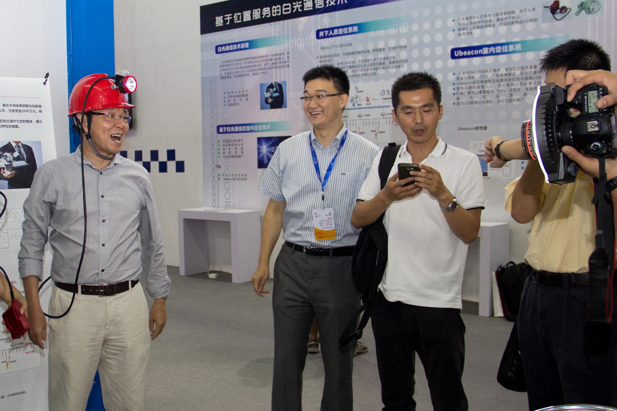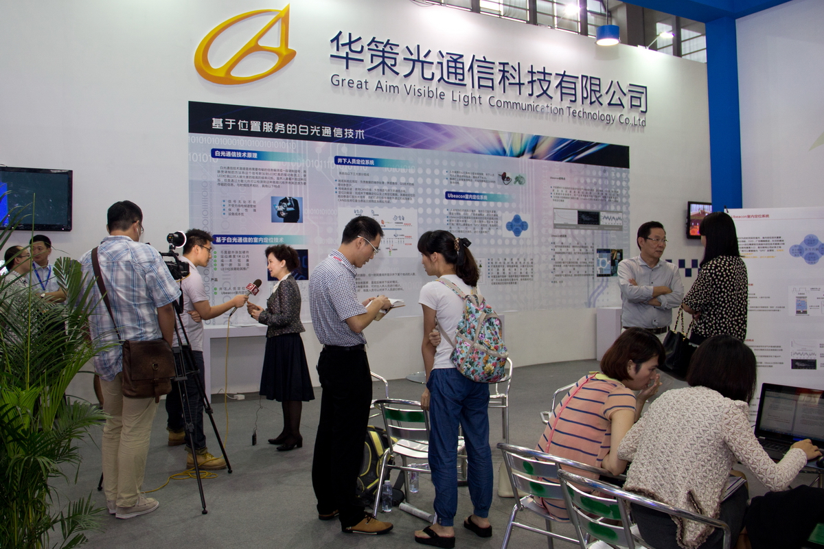 “基于位置服務(wù)的白光通信技術(shù)”深受各界高度關(guān)注。華策光通信科技有限公司展區(qū)前人頭攢動:記者、學者、企業(yè)家忙于采訪、交流、洽談……