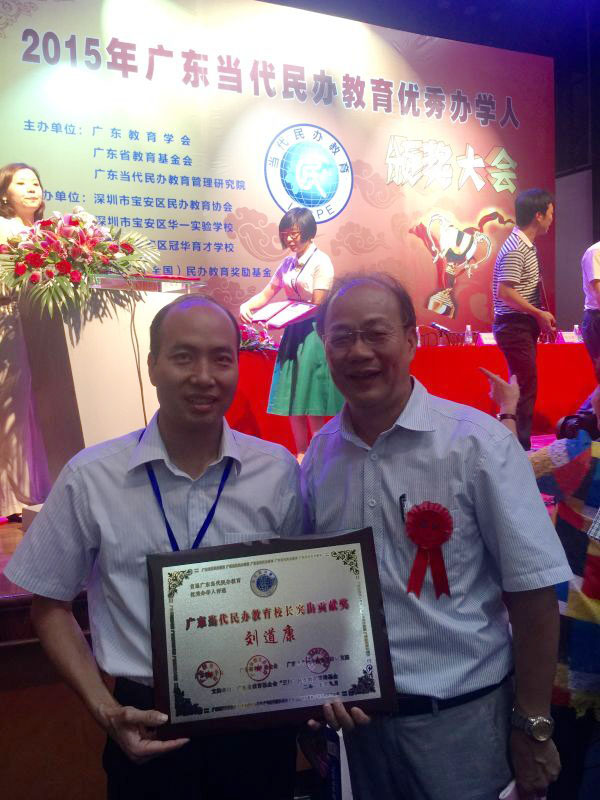 首屆“廣東當(dāng)代民辦教育優(yōu)秀辦學(xué)人”頒獎(jiǎng)大會(huì)于2015年9月18日上午在深圳市寶安區(qū)群眾文化藝術(shù)館隆重舉行。本次活動(dòng)由廣東教育學(xué)會(huì)、廣東當(dāng)代民辦教育管理研究院、廣東省教育基金會(huì)共同舉辦,參加大會(huì)的還有此次獲獎(jiǎng)的優(yōu)秀辦學(xué)人以及全省各地的其他民辦學(xué)校舉辦人和校長(zhǎng)約250人。