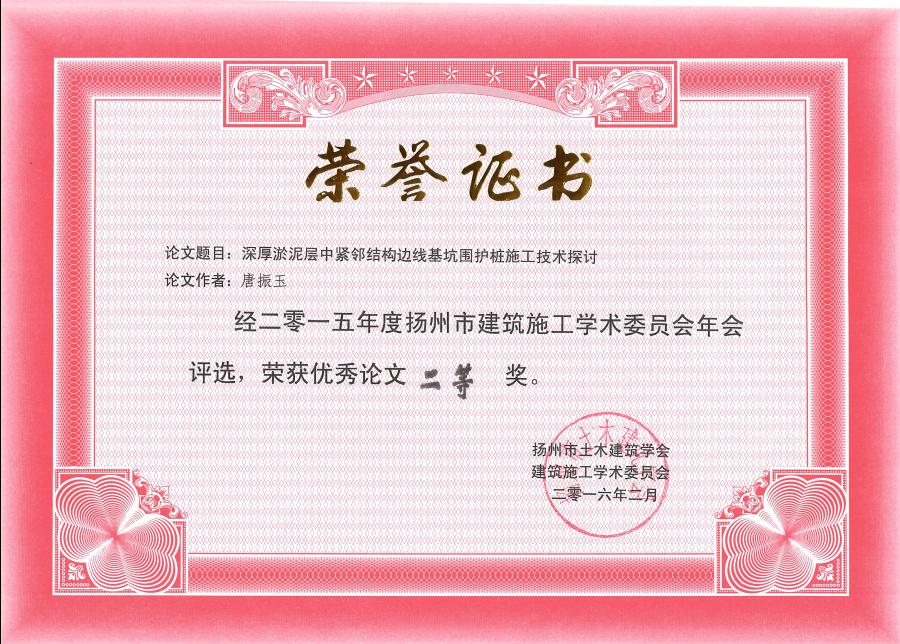 2016年2月23日至24日,由揚(yáng)州市科學(xué)技術(shù)協(xié)會(huì)主辦,揚(yáng)州市土木建筑學(xué)會(huì)、建筑施工學(xué)術(shù)委員會(huì)協(xié)辦的2016揚(yáng)州科技論壇土建學(xué)會(huì)分論壇建筑施工學(xué)術(shù)論文交流會(huì)在揚(yáng)州怡園飯店召開。江蘇華建華策國際大廈項(xiàng)目部報(bào)送的4篇論文:《超深三軸攪拌樁在珠海橫琴華策國際大廈工程深基坑中的應(yīng)用》及《BIM技術(shù)在華策國際大廈施工管理中的應(yīng)用》獲得一等獎(jiǎng),《珠海橫琴華策國際大廈項(xiàng)目超長旋挖灌注樁鉆巖施工技術(shù)》及《深厚淤泥層中緊鄰結(jié)構(gòu)邊線基坑圍護(hù)樁施工技術(shù)探討》獲得二等獎(jiǎng),并被推薦至江蘇省土木建筑協(xié)會(huì)參加交流,加上2014年度2篇獲獎(jiǎng)?wù)撐模卷?xiàng)目已有6篇論文獲得省、市級(jí)獎(jiǎng)項(xiàng)。