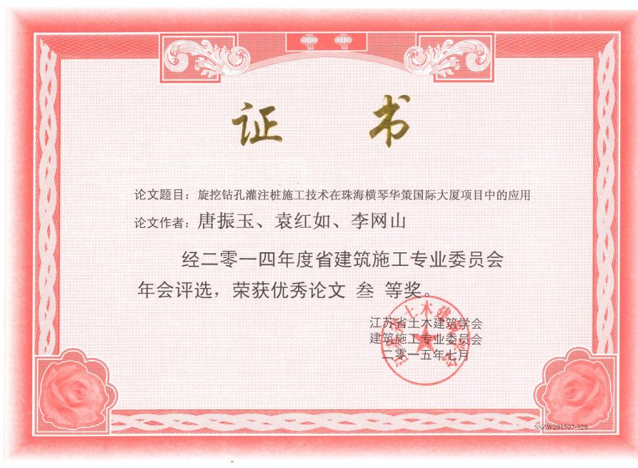 《超深三軸攪拌樁在珠海橫琴華策國際大廈工程深基坑中的應(yīng)用的榮譽(yù)證書》
