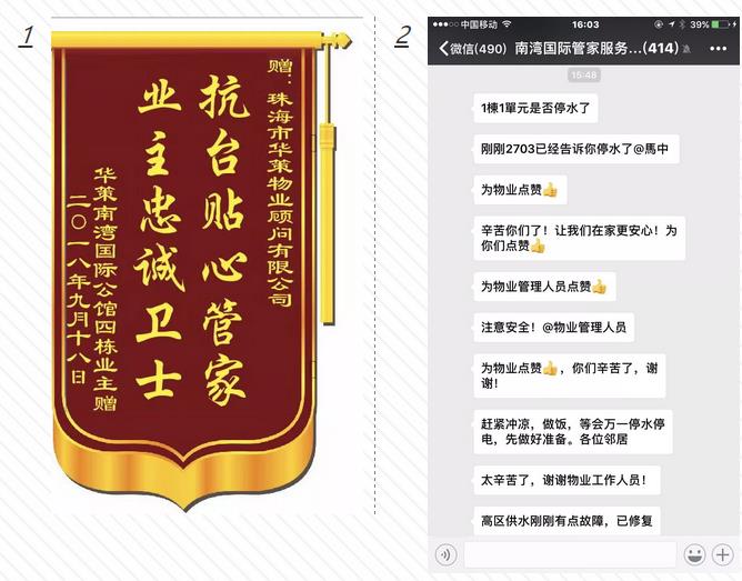 為業主服務,與時間賽跑,同風雨抗爭。9月16日,2018年地表最強臺風“山竹”來襲!物業公司的工作人員和保安全部在崗,南灣國際小區除了開辟兩條電話熱線隨時等候業主的求助召喚,更不顧風雨主動排查險情,主管人員帶隊巡查地下車庫排水系統,確保80臺水泵工作正常。