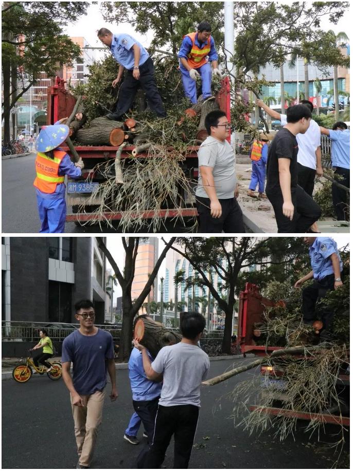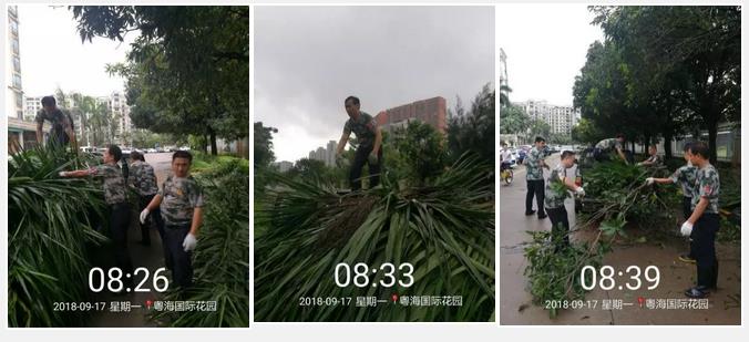 9月17日,粵海國際花園項目副經理陶端智帶著秩序隊員清理小區損壞的樹木,項目經理陳廷勇負責開車