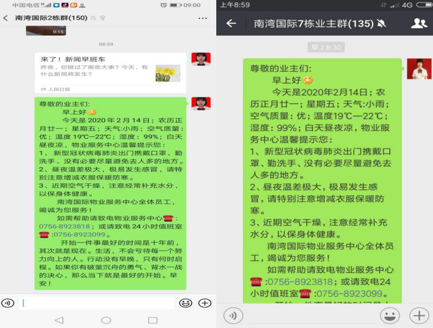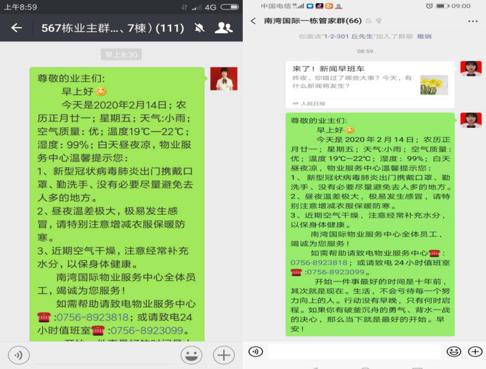 非常時期,健康人居成為每一個人安身立命之本,與疫情作戰就是在與時間賽跑。1月23日,大年二十九,“武漢封城”的信息傳來,自稱“小女生”的南灣國際公館物業項目副經理王萍萍看著不斷被疫情刷新的微信群信息,心頭一緊,在收到疫情防控的工作要求后更是心慌意亂,不知如何是好,著急得哭了起來。過了一會,王萍萍想了想,小區7棟居民樓的共計1485多居民的健康可不是小事,作為春節期間的物業負責人,在物業其他領導因疫情防控,暫時不能回來的情況下,必須獨自撐起來。