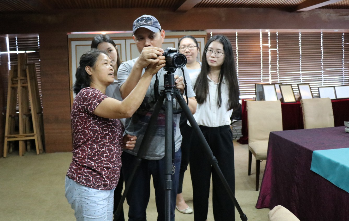 Administrativelogistics clerk Peng Yanhua (1st L ) is practicing photographing onthe spot